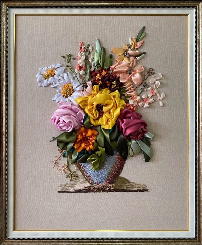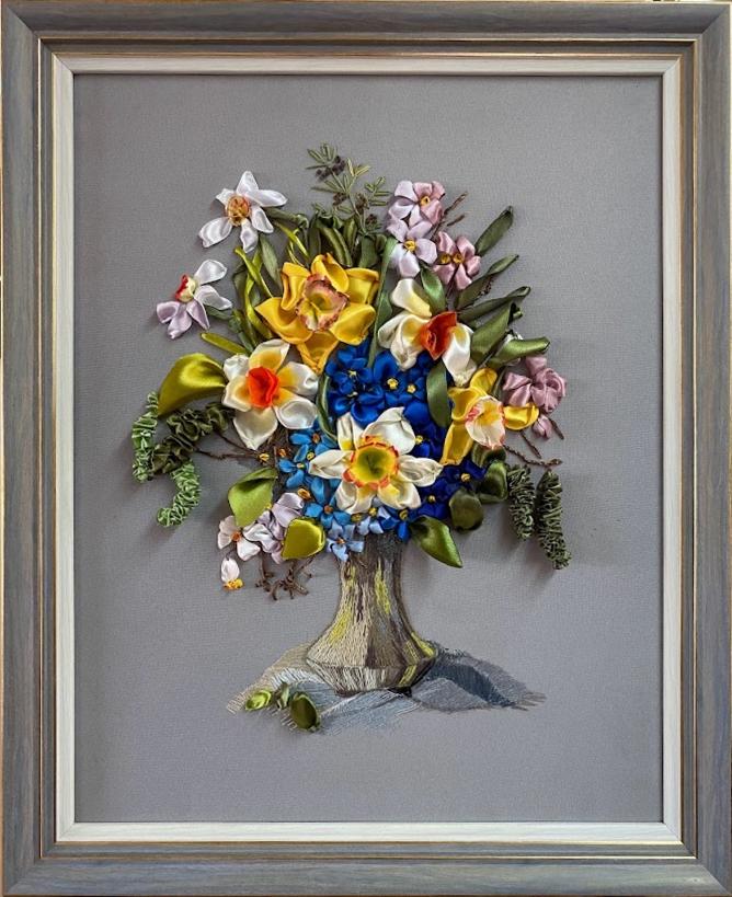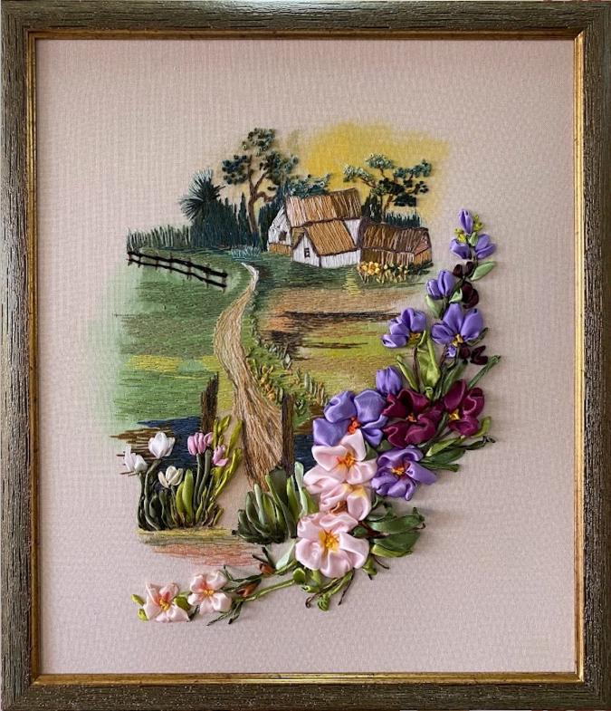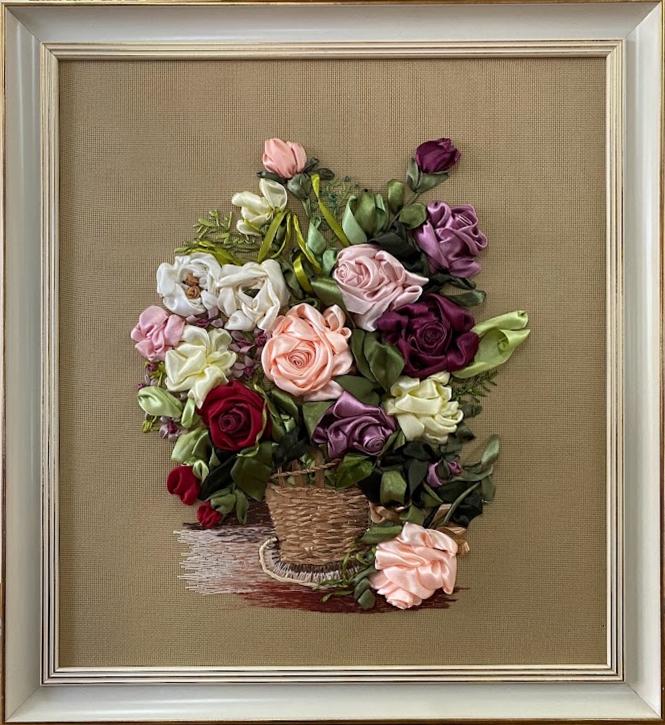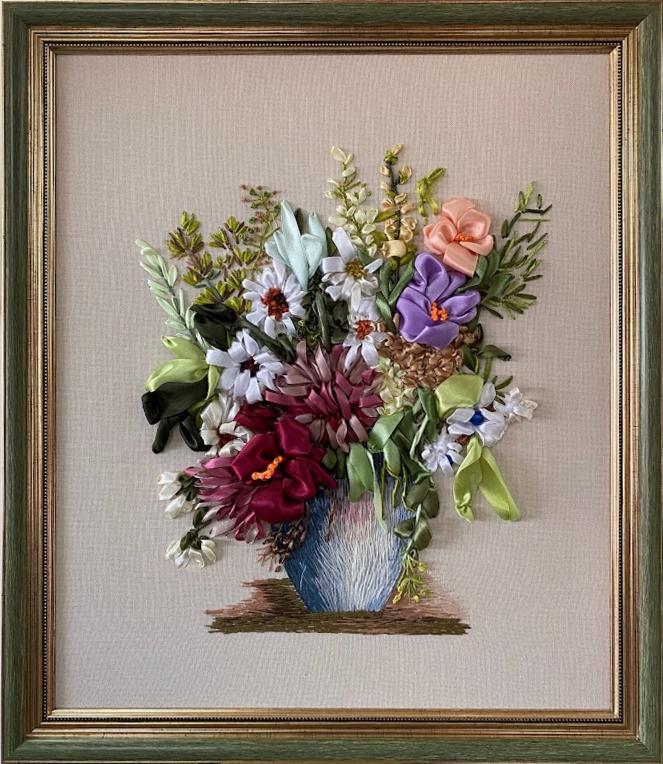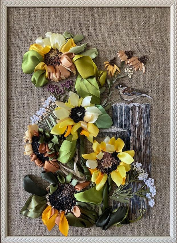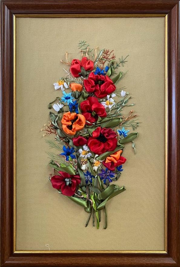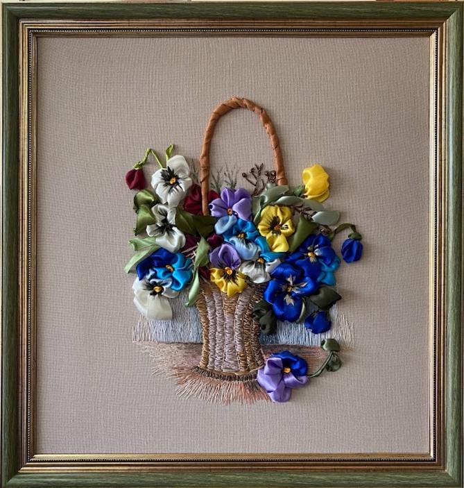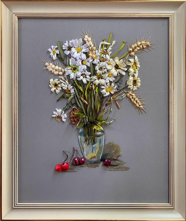 Лариса Скуратова – створює живописні картини атласними стрічками та нитками, є бібліотекарем з великим стажем роботи, на даний час – завідувач публічно-шкільної бібліотеки с. Великий Олексин. Сім’ю має творчу, тому образотворче мистецтво їй близьке. А ще вона працювала вчителем образотворчого мистецтва у Великоолексинському ліцеї. Вишивкою стрічками почала займатись 6 років тому, після того як в книгарні натрапила на книгу «Вишивка атласними стрічками».