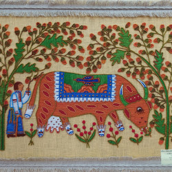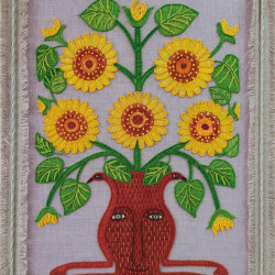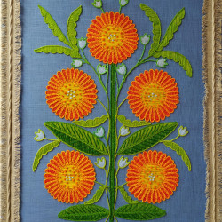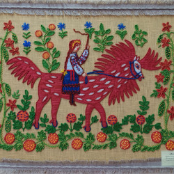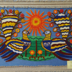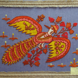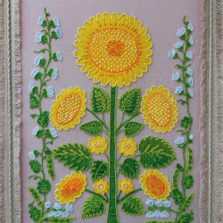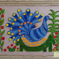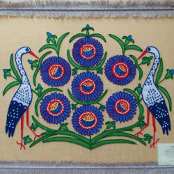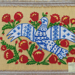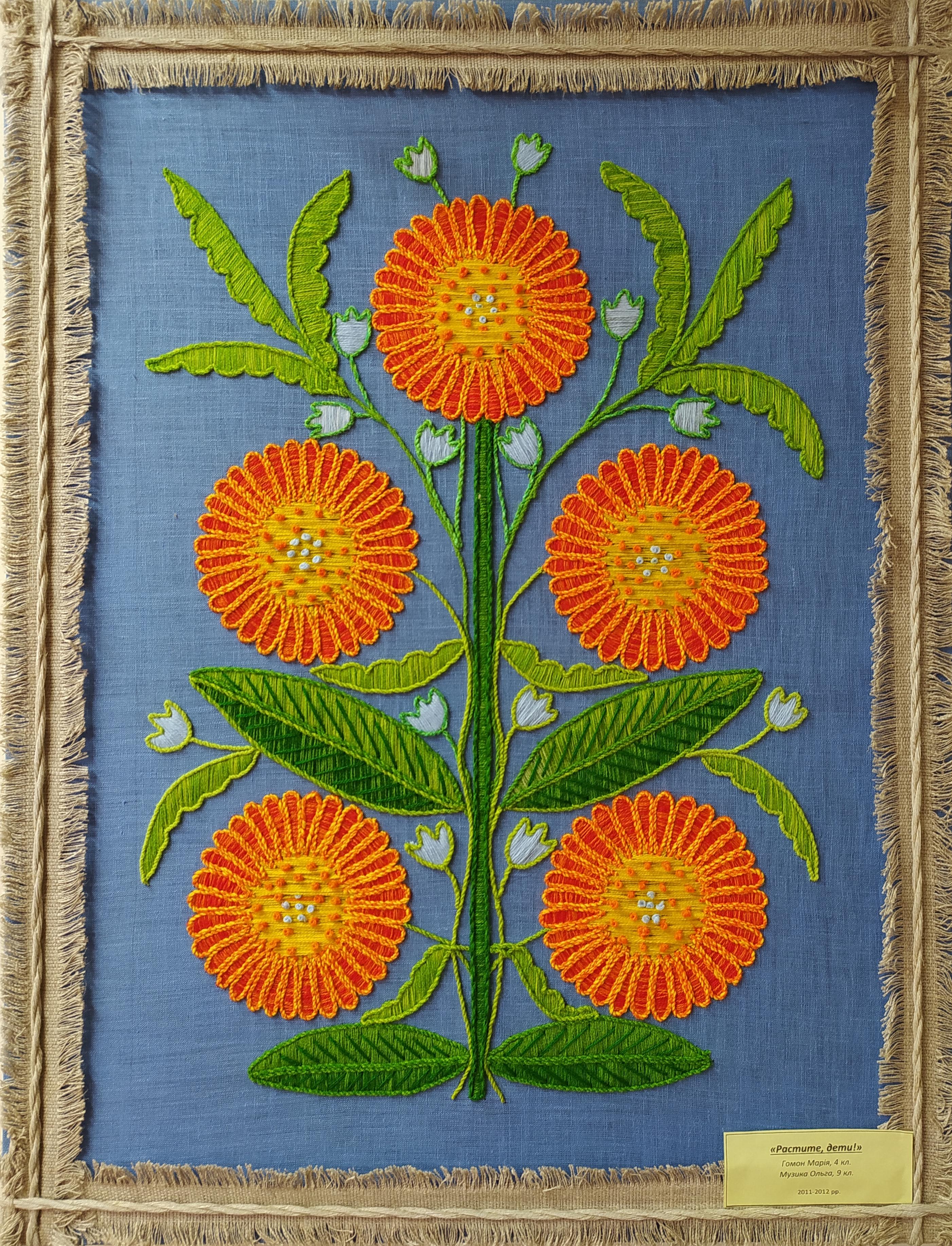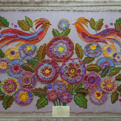На виставці представлено вишиті картини – роботи учнів, які займаються у зразковому гуртку художньої вишивки Рівненського ліцею № 23 під керівництвом Людмили Лисюк, створені за мотивами картин видатної української народної художниці Марії Примаченко.